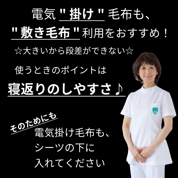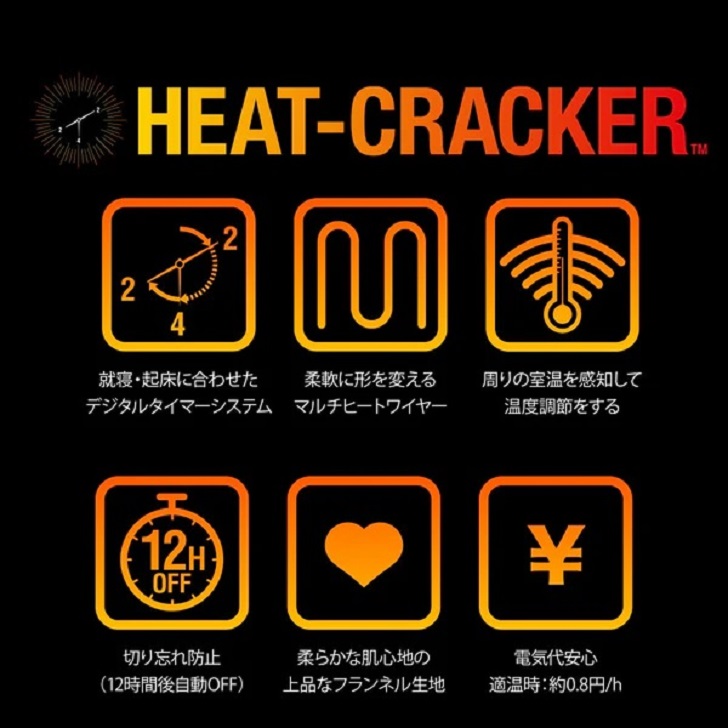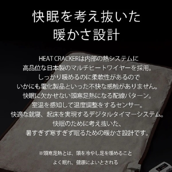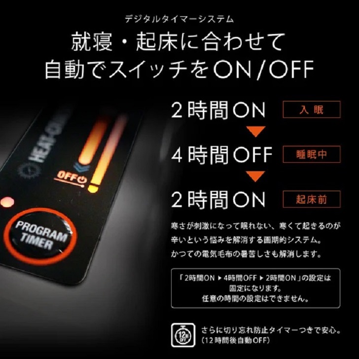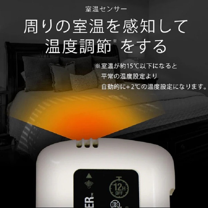 | ・就寝、起床に合わせたデジタルタイマーシステム ・柔軟に形を変えるマルチヒートワイヤー ・周りの温度を感知して温度調整をする ・切り忘れ防止タイマー(12時間後自動OFF) ・柔らかな肌心地の上品なフランネル生地 ・水に強く丸洗いOK(ドラム式洗濯機不可) | |