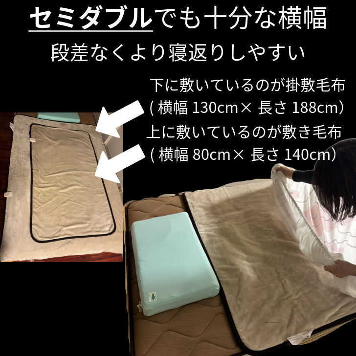 | シングル・セミダブル 幅130×長さ188㎝ ※一般的なシングルサイズの幅は100cm、セミダブルサイズの幅は120cmですので、十分横幅を覆える大きさです。 | |