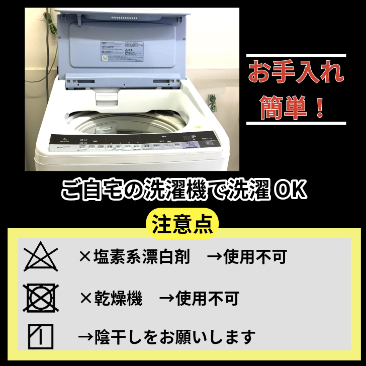 | ・手洗いもしくは洗濯機の場合は毛布洗い、ウール洗い、手洗いコースなどをお使いください。 ・漂白剤の使用は不可です。 ・乾燥機の使用は不可です。 ・洗濯後は日陰の陰干しをおすすめしております。 ・コントローラーは水洗いできません。必ず電源プラグを取り外して洗濯してください。 ・コネクター受け部は毛布と一緒に洗濯をすることになりますが、洗濯機で洗う場合、洗濯槽が痛まないように毛布本体の内側になるようにして毛布洗いネットに入れてお洗濯いただくことをおすすめしております。 ・洗濯後は絞らずに風通しの良い日陰に干し、自然乾燥させてください。通電して温めて乾燥することはできません。 ・しっかりと乾かしてから使用をしてください。 | |