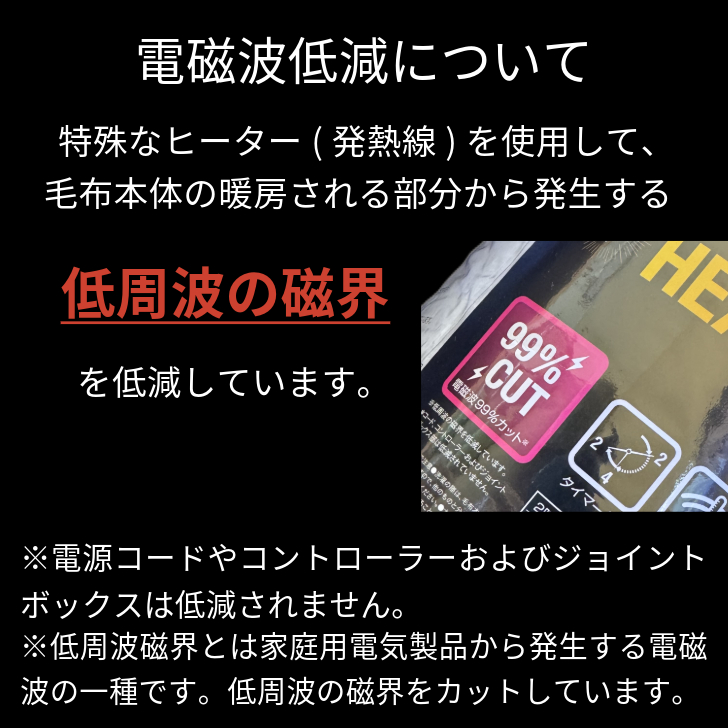 | 特殊なヒーター(発熱線)を使用して、毛布本体の暖房される部分から発生する低周波の磁界を低減しています。 ※電源コードやコントローラーおよびジョイントボックスは低減されません。 ※低周波磁界とは家庭用電気製品から発生する電磁波の一種です。低周波の磁界をカットしています。 | |